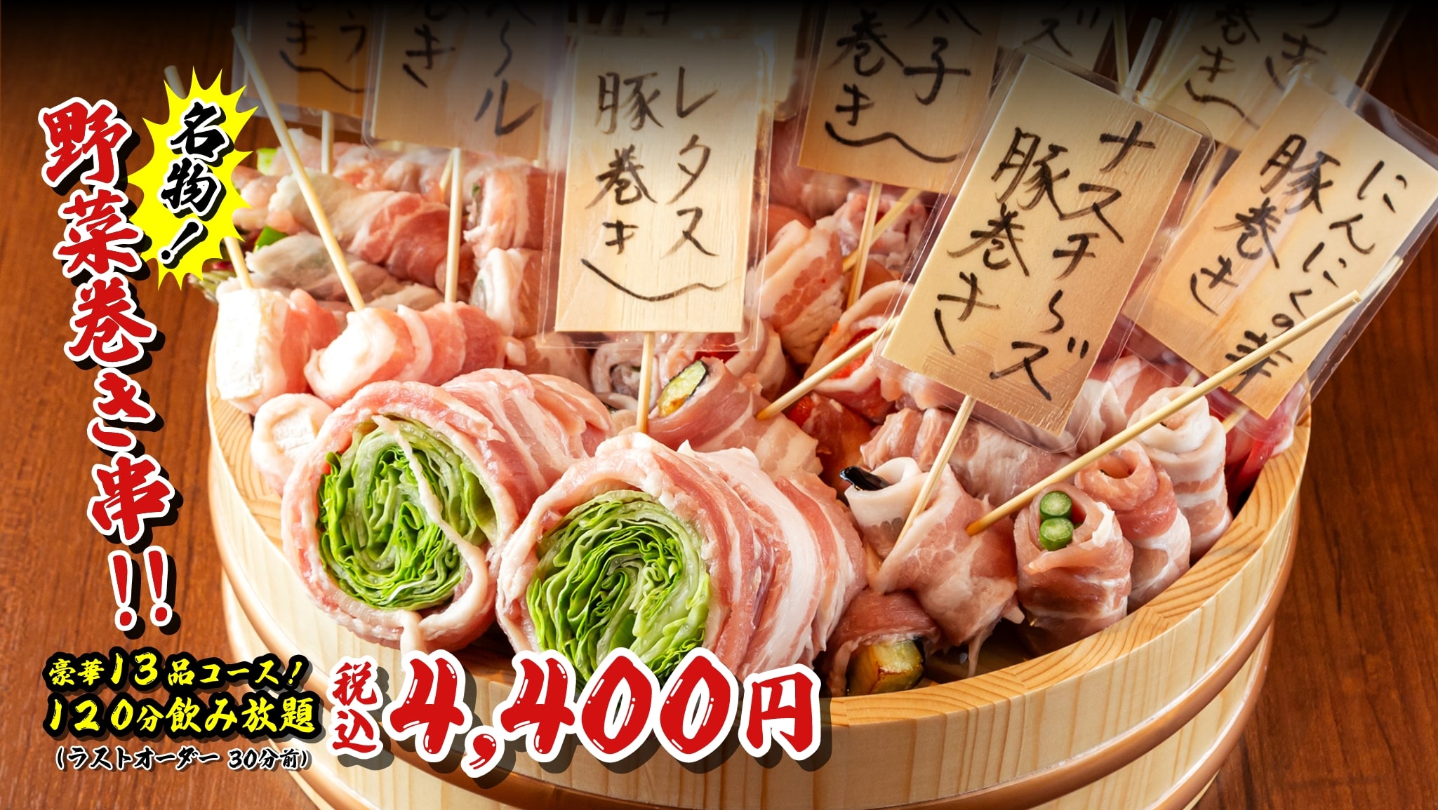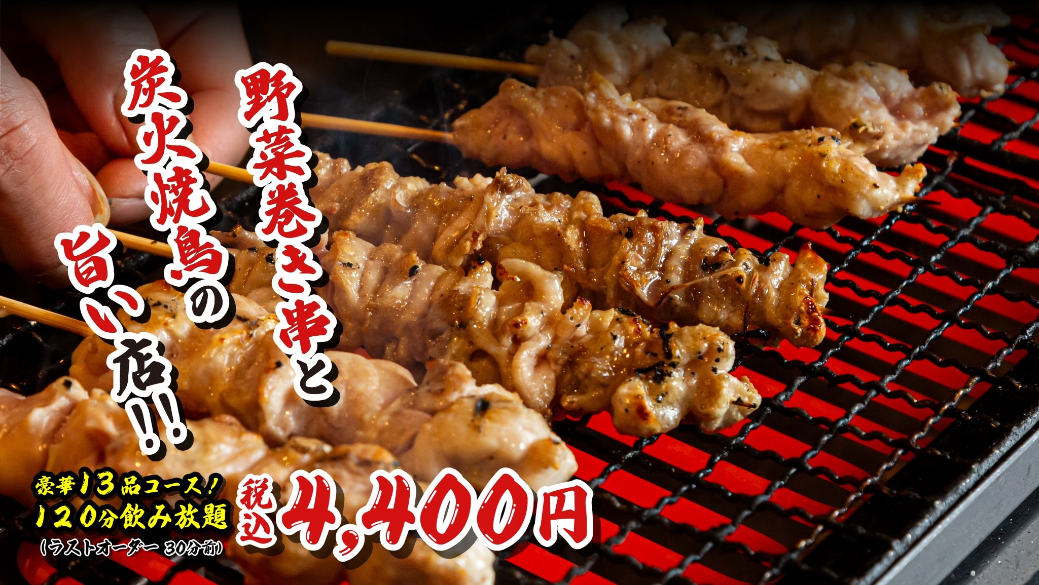 焼きんしゃい名物の「野菜巻き串」や「炭火焼鳥」「自慢のつくね」などオススメの料理を堪能できるコースです。さらに120分の飲み放題では「プレミアムモルツ香るエール」を含む多種多様なドリンクをお楽しみいただけます。居心地よい空間で、美味しい料理と共に楽しいひとときをお過ごしください! ※ラストオーダー30分前